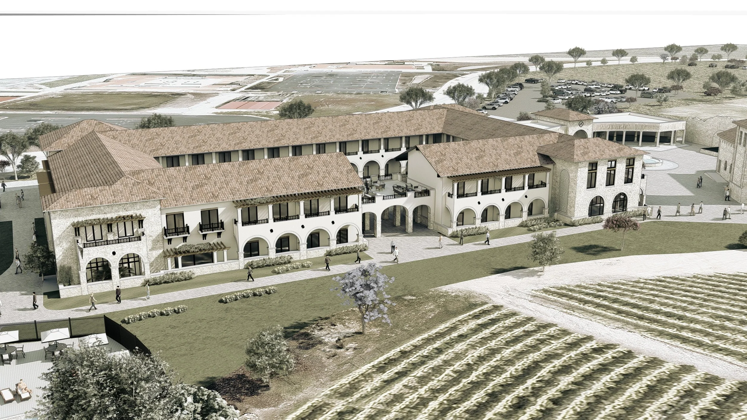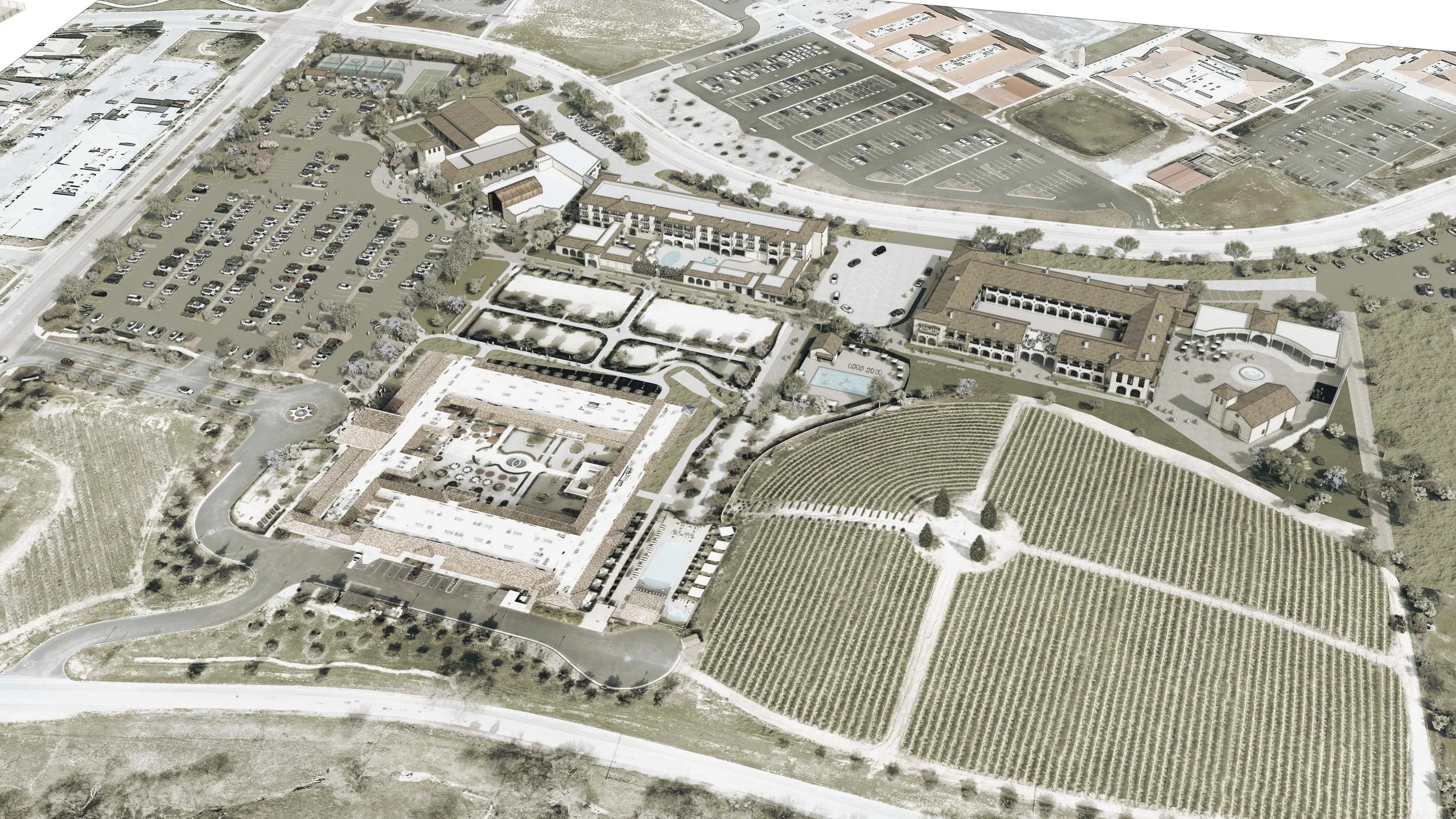 The proposed Ayes Allegretto Resort Expansion was envisioned as a transformative hospitality destination that would elevate the existing resort into a more comprehensive luxury retreat centered on wellness, events, and immersive guest experiences. The concept reflects a thoughtful, ambitious master plan to expand both capacity and amenities while enhancing the character of the existing property.